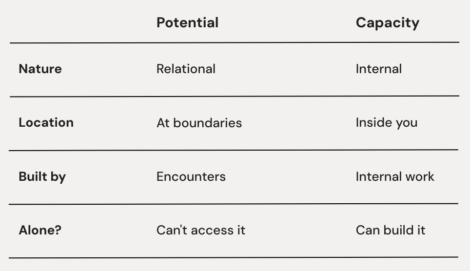 Potential is what you could become or achieve—the futures available to you. And here’s the key: potential doesn’t live inside you. It lives at the boundaries between you and things outside you. Your potential isn’t stored up waiting; it emerges when your capacity meets an opportunity, a problem, a collaborator, an environment that generates new possibilities.