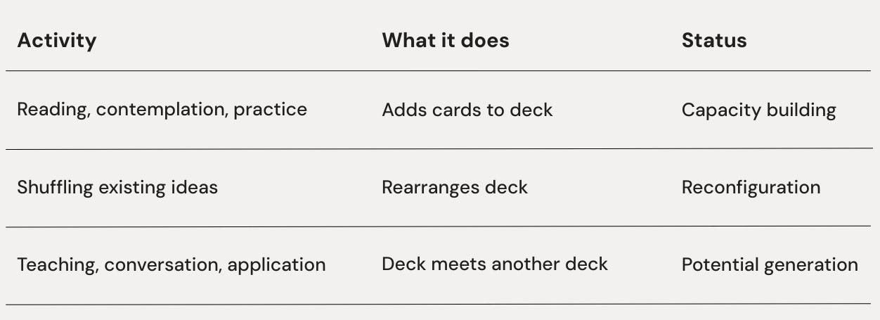 He reads philosophy, contemplates texts, and builds frameworks for understanding. He adds cards to the deck—new terms, new mental models, new ways of seeing.