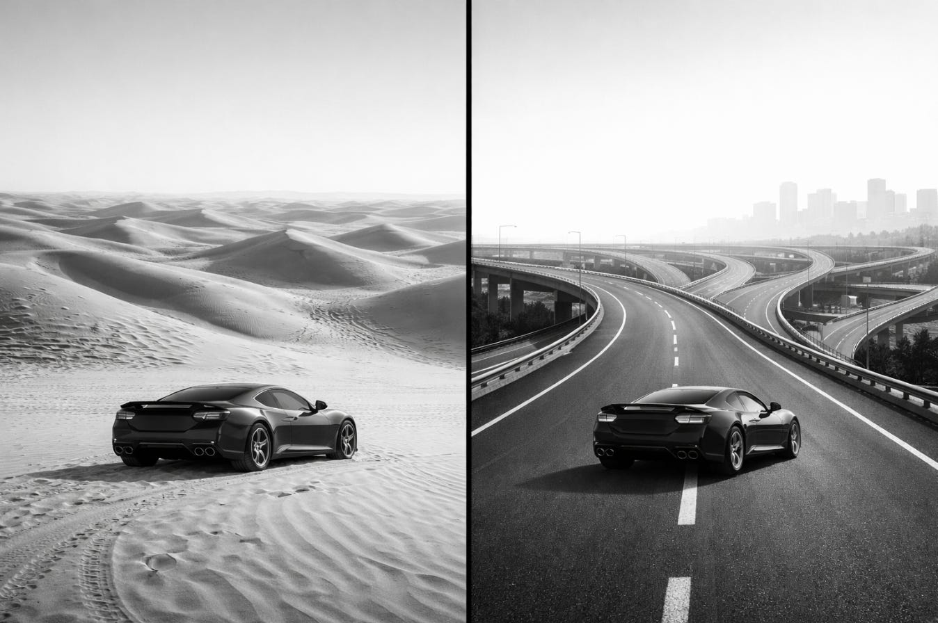 The same Ferrari connected to a highway network opens the world.