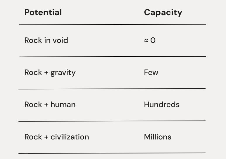 Who “has” this potential? Neither. It doesn’t exist until the encounter. The rock didn’t store it. The human didn’t unlock it. The boundary generated it.