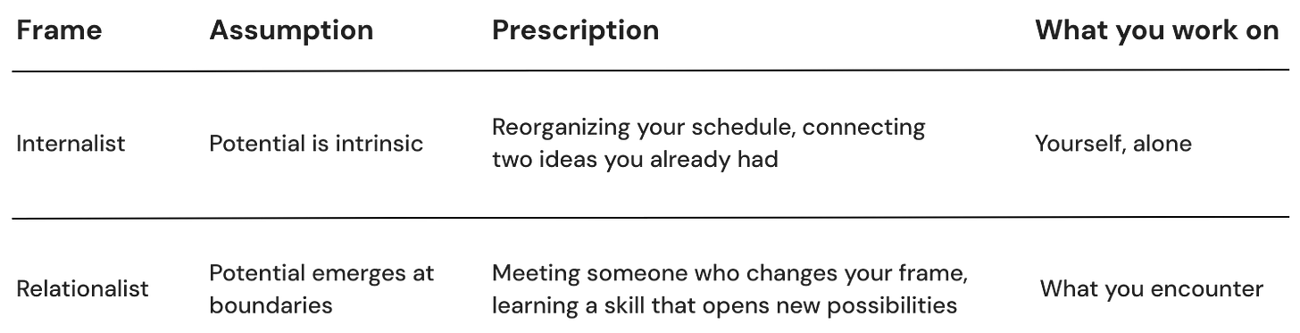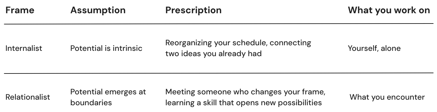 Keep in mind: Internalism treats potential as internal property; relationalism treats potential as boundary-emergent. They prescribe opposite interventions. Internalist interventions plateau; boundary interventions transform.