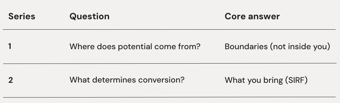 Series 1 established something counterintuitive: potential doesn’t live inside you; it emerges at boundaries, generating new reachable futures.