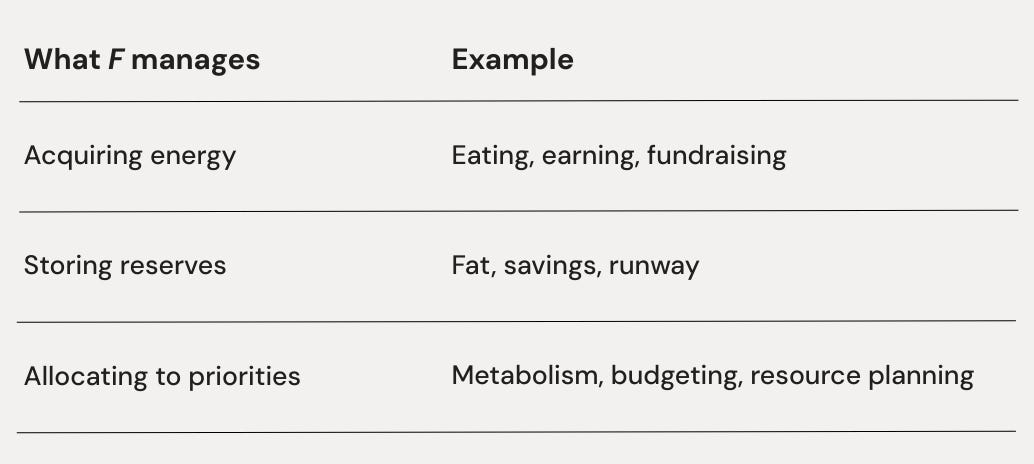 Individual: Sleep, nutrition, financial reserves. You acquire energy through eating and rest, store it in body fat and bank accounts, allocate it through metabolism and spending. Run out of either biological or financial F, and you dissolve as an organized system.