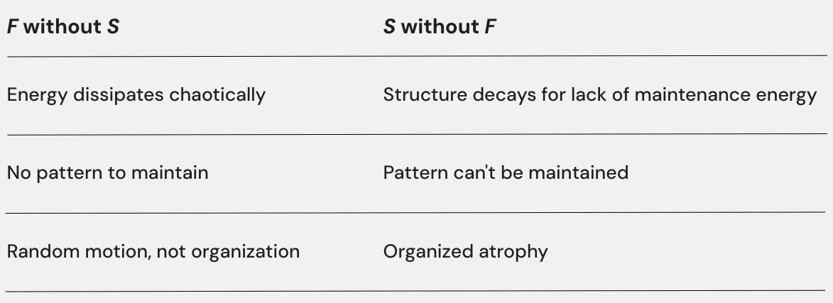 You can have strong S and lose F. An organization with beautiful structure but no funding will collapse just as surely—but it collapses in an orderly way, like a skeleton without muscles.