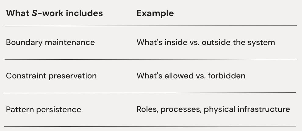 When roles are clear, you don’t notice them. When processes work, you just do them. When infrastructure functions, you take it for granted. S-work only becomes visible when it fails—when confusion erupts, when systems break, when the structure that held things together suddenly doesn’t.