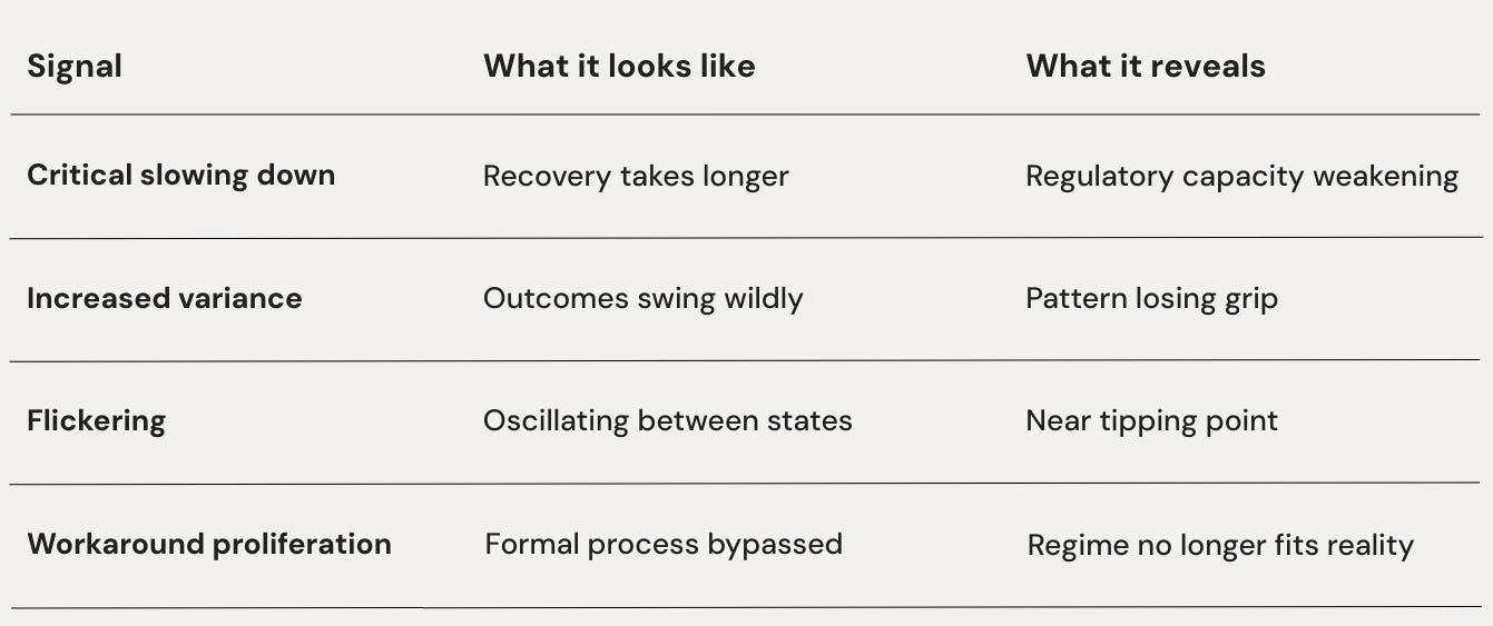 Keep in mind: Regime failure is measurable. The early warning signals—slowing recovery, rising variance, flickering, workaround proliferation—are leading indicators that predict transition before lagging indicators show collapse. Stressed regimes respond to support. Failed regimes consume it.