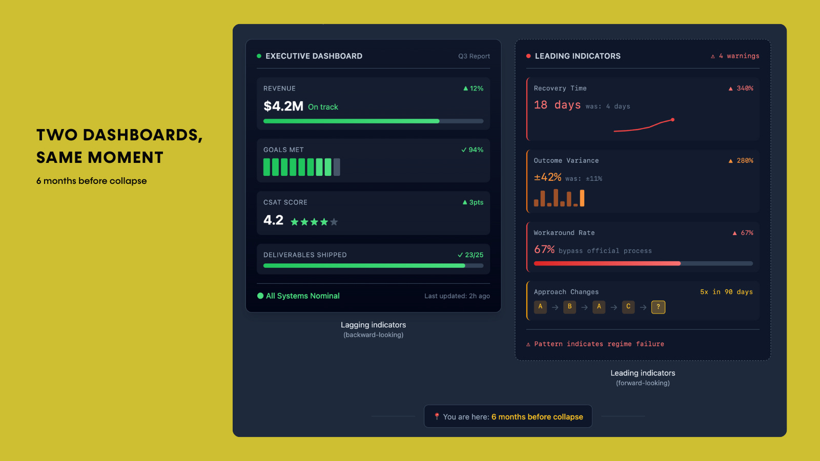 By the time lagging indicators show failure, that regime has already failed. The transition is underway, whether you’re ready or not. This is why so many failures feel “sudden”—the backward-looking dashboard stayed green until the moment of collapse.