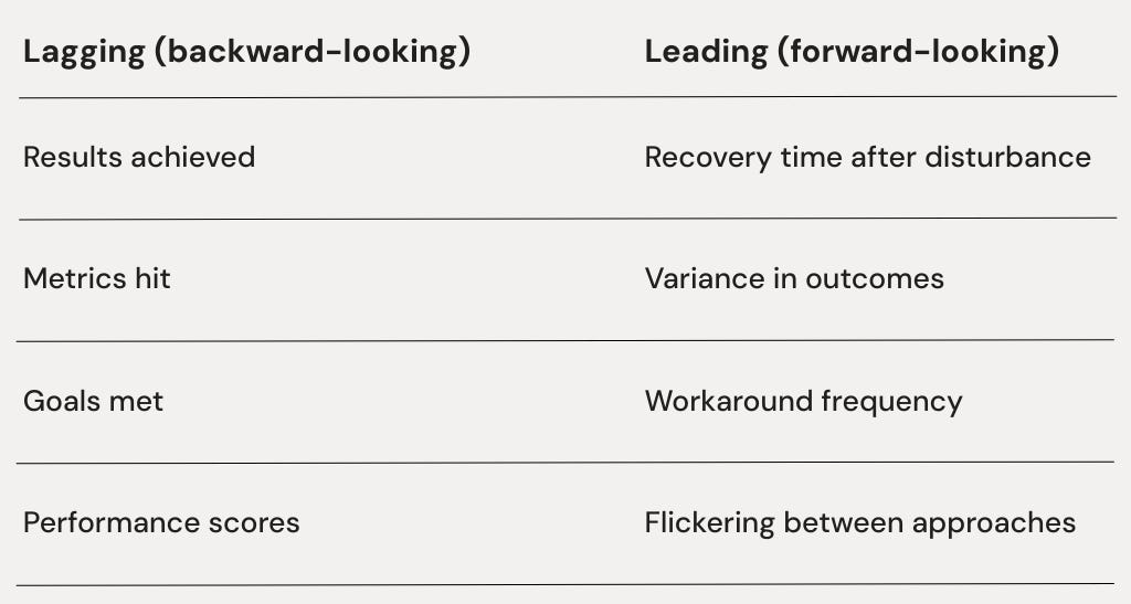 Most measurement systems are backward-looking. Results, revenue, performance metrics—these tell you how the regime performed. Past tense.