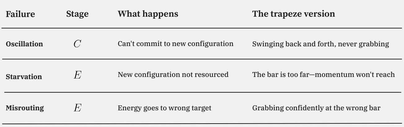 Misrouting (E failure): Energy flows—but to the wrong place. Resources deploy, work happens, but it’s not reaching the configuration that would actually produce transformation.