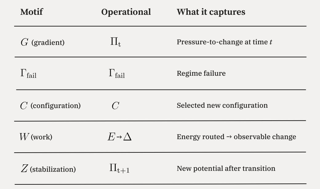 The key move is splitting W (work) into E (energy flowing) and Δ (change occurring). Why? Because energy can flow without change happening. (That’s the entire premise of post 3.7—that most change is theater.)