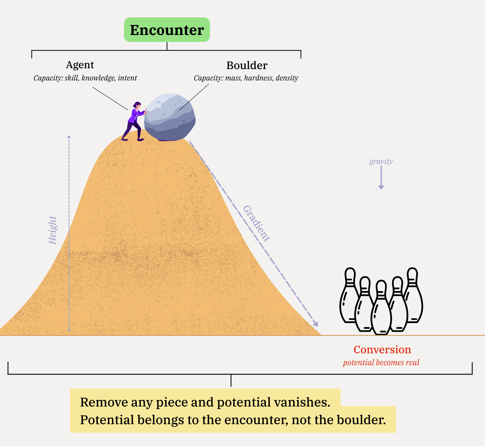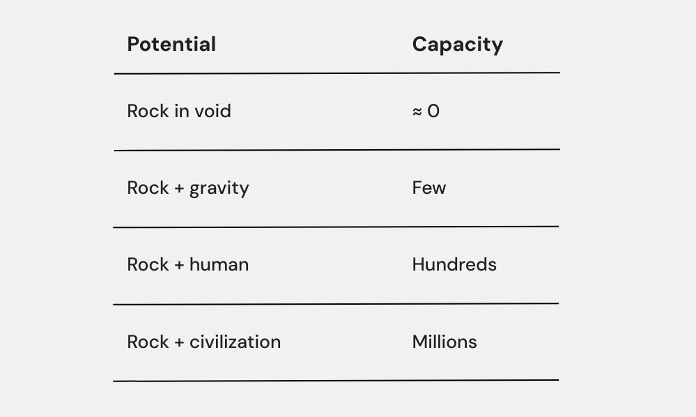 A rock alone in a field. What’s its potential? To do what? For who? The question collapses without gravity or another agent in the picture, whether human or animal. The rock has capacity. It has no potential. Not yet.