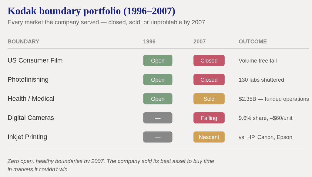 By 2007, eleven years after its peak, Kodak had zero open, healthy market boundaries.