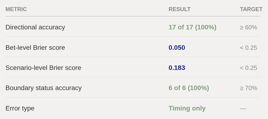 The bet-level score (0.050) averages across all 17 individual predictions—each assigned probability against its binary outcome. Five times better than the no-skill baseline.