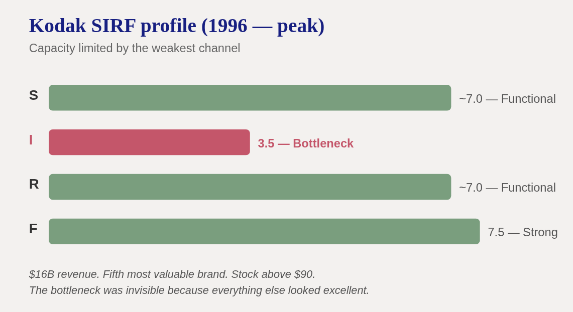 At peak, Kodak’s structure was functional, relationships were deep, and resources were strong (F = 7.5). But the information channel—the company’s ability to sense reality and correct course—scored 3.5. That’s the bottleneck. Capacity limited by the weakest channel.