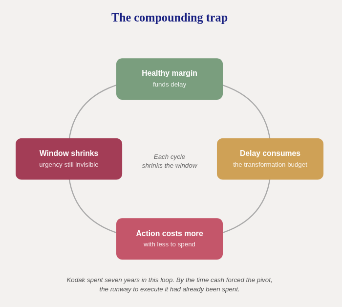 This is the compounding trap: delay consumes the resources needed to act, which makes the eventual action more expensive, which consumes more resources. By the time cash pressure forces the pivot, the runway to execute it has already been spent.